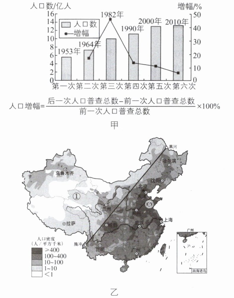 4 核心素养综合思维 [原创]我国于2020年开展第七次全国人口普查。人口普查可以引导养老、医疗、卫生、健康产业精细化发展。建设体育强国也离不开准确的人口数据支撑,无论是场地规划,还是政策制定都需要与人口发展协调匹配。中华人民共和国成立后,我国分别在1953年、1964年、1982年、1990年、2000年、2010年、2020年进行了七次人口普查。读我国第一至六次人口普查统计图(图甲)和人口密度分布图(图乙),回答下列问题。