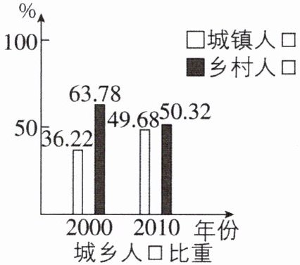 B 【解析】读图表可知,随着我国经济的发展,我国的城镇人口持续增加,A不符合题意;我国60岁及以上的人口2000年占10.33%,而2010年占13.26%,说明我国人口老龄化越来越明显,社会养老负担逐渐加重,B符合题意;我国15~59岁的人口2000年占66.78%,2010年占70.14%,说明劳动力丰富,C不符合题意;2000年15岁以下的人口比重是22.89%,到2010年下降为16.60%,D不符合题意。故选B。
