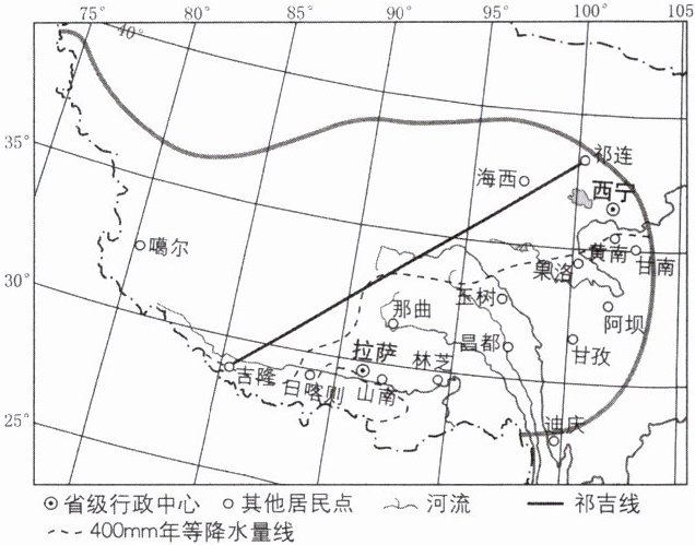 1[2025广东东莞模拟]“祁吉线”是指青海省祁连县和西藏自治区吉隆县的连线。这反映了青藏高原地区不仅人口稀疏,而且其内部人口分布差异也十分突出。读图分析,青藏高原地区人口空间分布特点是( )