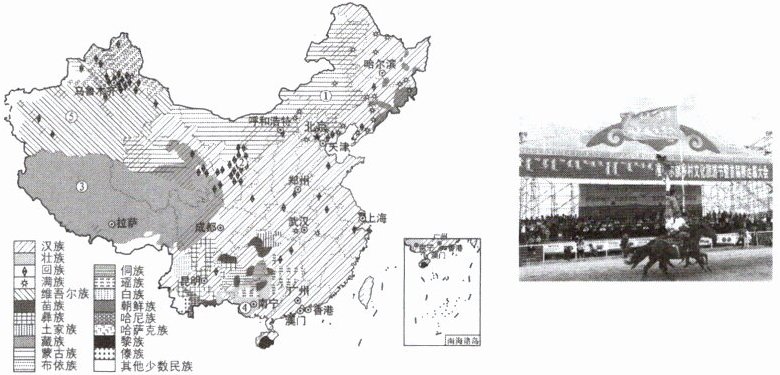 (3)上右图所示的是那达慕大会,是____族的传统活动,主要在____(省区)举行。