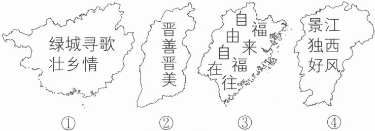 3 [2024广东茂名质检,难]我国各省份的宣传语各具特色,反映出他们对当地特色的定位。读①②③④四省份的轮廓图和广告语,判断下列说法错误的是 ( )