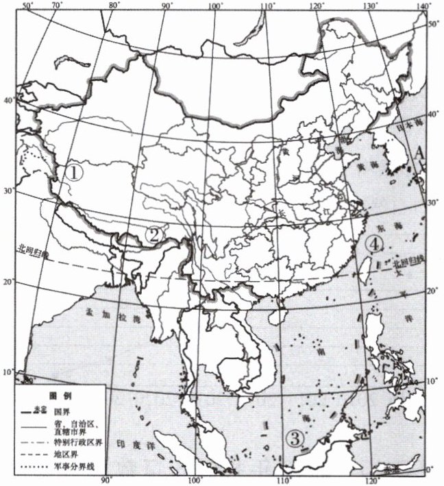 (2)与我国隔海相望的国家A是日本。我国海陆位置的优越性:日本是一个岛国,无法通过陆路与世界各国进行经贸往来;我国是一个海陆兼备的国家,既可以开发海洋资源,发展海洋贸易,也可以通过陆路与陆上邻国进行经贸往来。(其他答案言之有理即可)