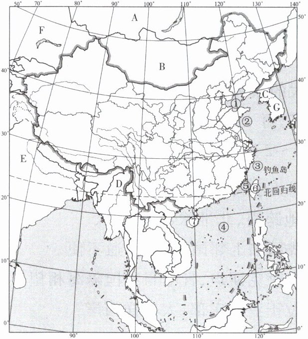 (2)渤海、琼州海峡是我国的内海。据图并结合所学知识可知,J代表的国家是菲律宾。