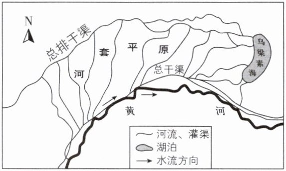材料:河套平原位于黄河“几”字形河道的最北端,早期以畜牧业为主,创造了草原文化。后来人们修建水渠,形成发达的灌溉系统,种植业发达,又孕育了农耕文化。下图为河套平原示意图。