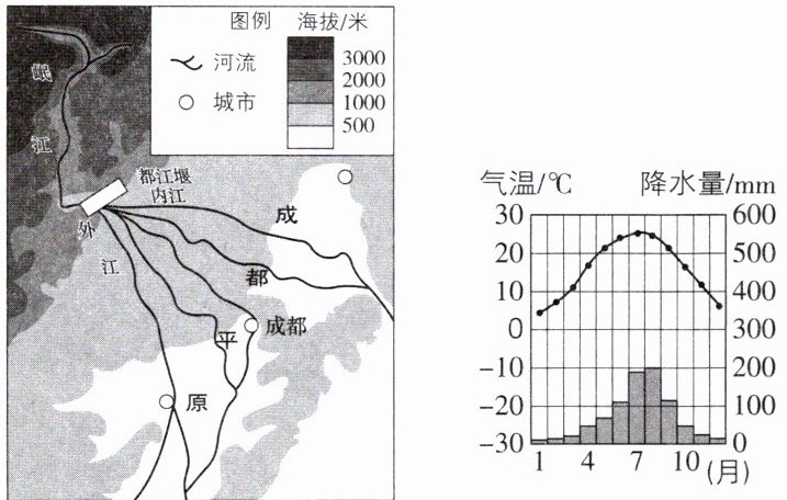 新考向传统文化[2025 山东淄博期中]都江堰是世界上唯一现存的无坝引水工程,历经 2 200 余年仍在发挥作用,守护成都平原。读都江堰位置图和成都气温曲线和降水量柱状图,完成 3~6 题。