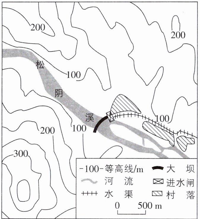 [2024 江苏南通中考]通济堰水利工程位于浙江省南部,由长 275 米、宽 25 米、高 2.5 米的拱形拦水大坝及进水闸、石函、淘沙门、堰渠、概闸、湖塘等部分组成,被列为世界首批灌溉工程遗产。该工程顺应地势变化修建水渠,基本实现自流灌溉。下图为通济堰位置及周边等高线地形图(单位:米)。据此完成 1~2 题。