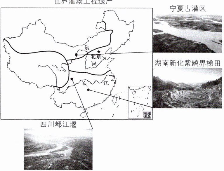 7 [2025 湖南邵阳模拟]目前,中国的世界灌溉工程遗产共有 38 项。下图为世界灌溉工程遗产中的三个。读图,完成下列问题。