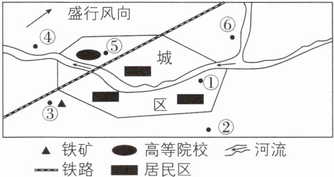 6. B 【解析】读图可知,①处靠近水源且位于河流中上游,水质较好,适合建自来水厂,A正确,不符合题意;②处位于城区之外,商业区应该建在交通便利、市场广阔、人口稠密的城区之内,B错误,符合题意;⑤处靠近高等院校,科技实力雄厚,人才充足,适合建高新技术产业园,C正确,不符合题意;④处位于郊区,靠近河流,水源充足,适合建乳畜及蔬菜基地,为城镇提供物资保障,D正确,不符合题意。故选B。