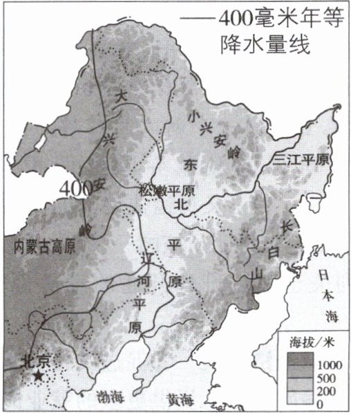 5. A 【解析】读图可知 (此处原文解析中“读图可知”后内容完整,按原文保留)大兴安岭东西两侧地形、降水差异较大。东侧位于东北平原,属于温带季风气候,适宜发展种植业;西侧位于内蒙古高原,属于温带大陆性气候,适宜发展畜牧业。故选A。