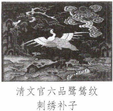 明清时的官服因其前胸及后背缀有用金线和彩丝绣成的补子,故称补服。通常文官绣鸟,武官绣兽,其中文官六品绣鹭鸶(即白鹭)。陆机《诗疏》云:“鹭,水鸟也,好而洁白,故谓之白鸟。”