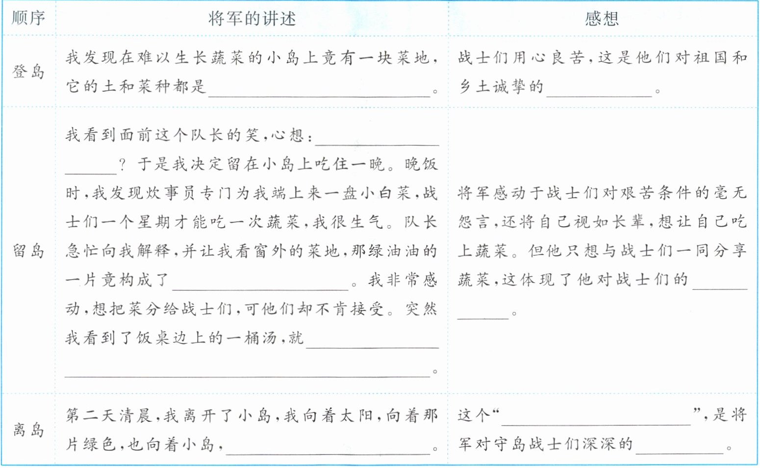 3. 小全把将军讲述的岛上故事记录了下来,并批注了自己的感想,请帮他把表格补充完整。