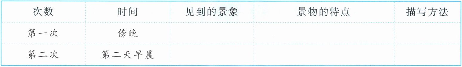 3. 体会美景 小全回忆了巴金爷爷两次经过“鸟的天堂”时看到的不同景象,请你填表格,体会“小鸟天堂”的美丽。