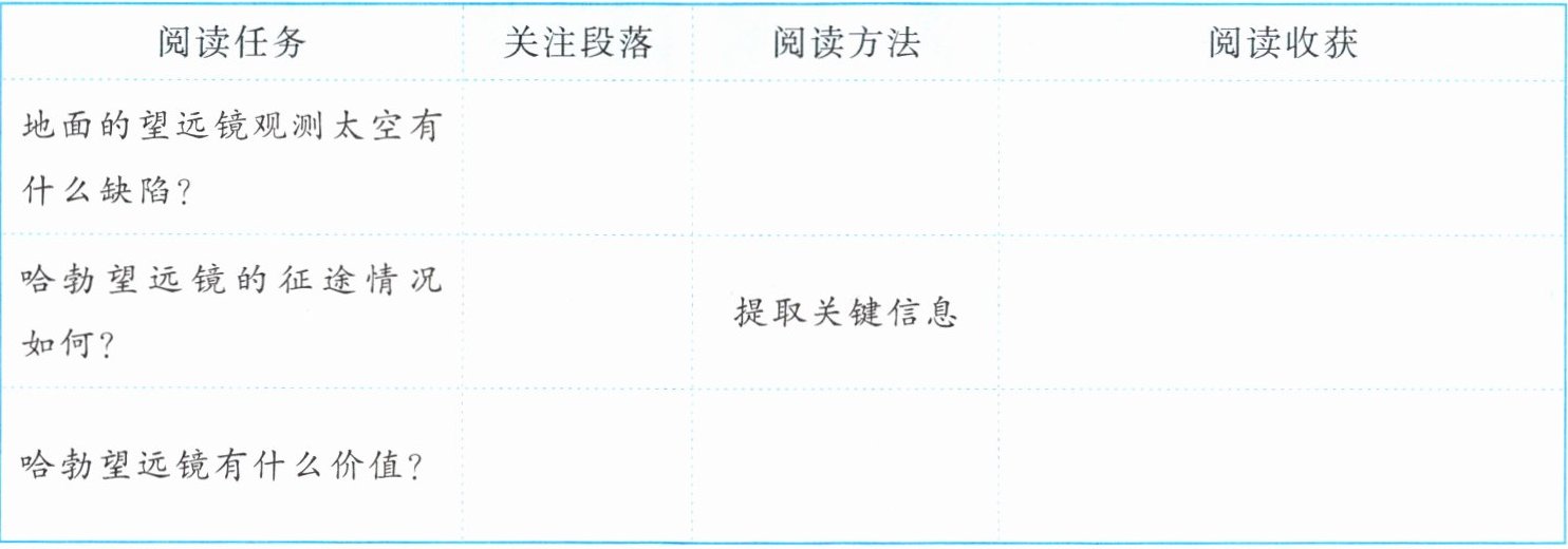 3.(1)(第二行)第②自然段 圈画关键句 一 是地球大气层会吸收红外线和紫外线,二是大气湍流导致地面光学望远镜的角分辨率很难优于1弧秒。 (第三行)第③自然段 开始不能辨别140亿光年以外的物体,组成部分也出现故障,但经历了五次维修,它的观测能力已是最初设计的100倍。 (第四行)第④自然段 提取关键信息 哈勃空间望远镜得到的数据引发了天文学的革命,并且把宇宙论、神学、哲学和天文学贯穿了起来。