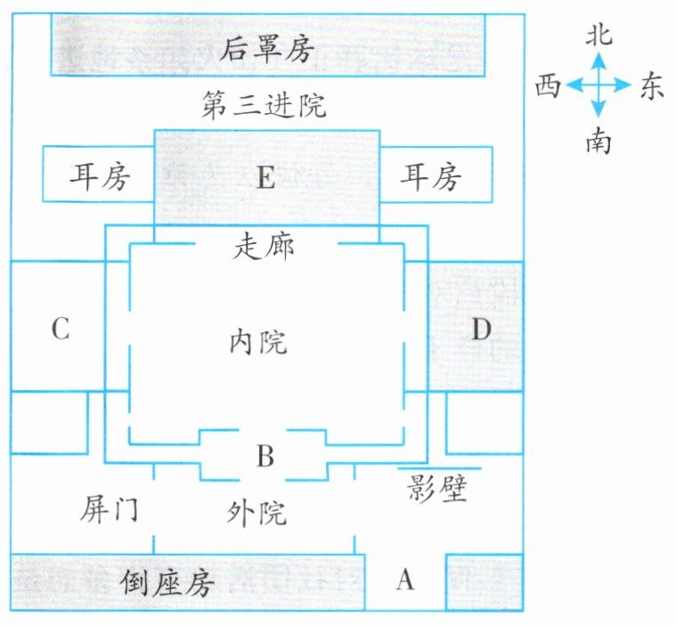 (3)结合材料三想一想:“正门、垂花门、正房、东厢房、西厢房”分别对应“三进院落平面图”中A、B、C、D、E中的什么位置?写在下面对应的横线上。