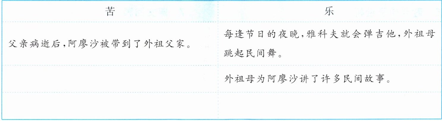 (2)在《童年》中,我们认识了苦乐交加的阿廖沙。请结合具体事例填写表格。