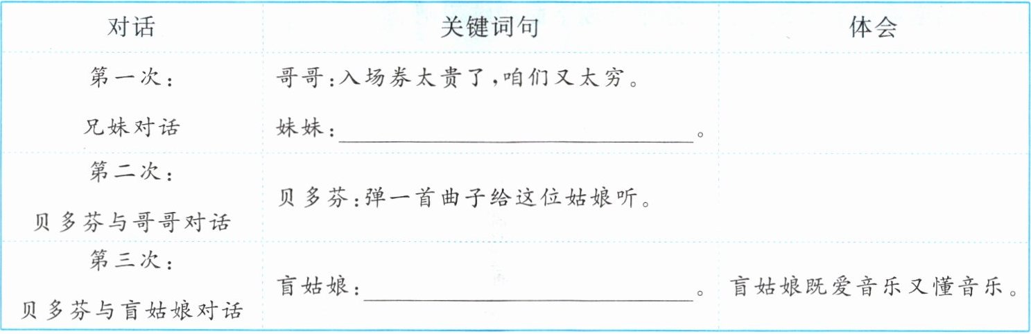 (1)(第二行)别难过,随便说说 兄妹情深,妹妹善解人意。(第三行)贝多芬同情兄妹俩。(第四行)弹得多纯熟哇,感情多深哪
