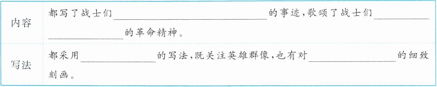 5. 对比阅读 本文与《狼牙山五壮士》在内容、写法上有哪些相似之处?完成表格。