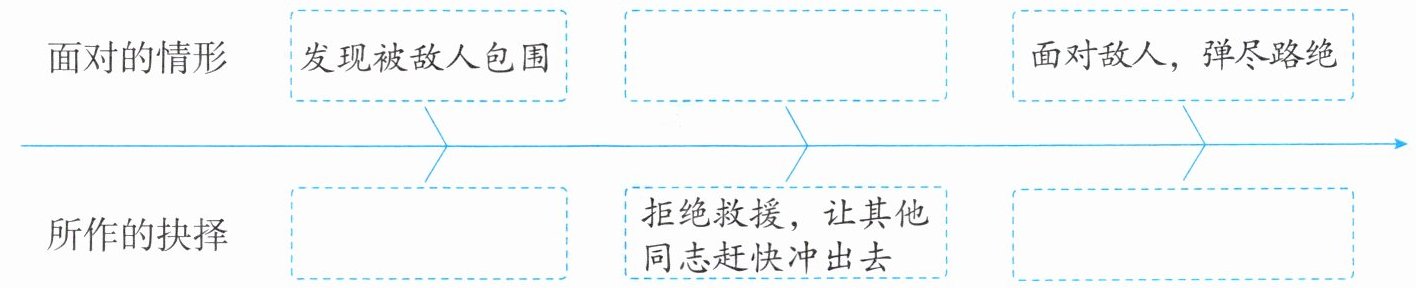 1.(第一行)鬼子兵扑过来,部队首长要营救 (第二行)向敌人射击,掩护部队突围 投江 殉国 2.示例:这句话连用两个“没有”,强调八位女战士处于绝境,形势危急,赞美了她们视死如归的高贵品质。 3.这句环境描写写出抗联部队的作战环境恶劣,形势危急。 这是对安顺福的语言描写,生动形象地写出了战士大无畏的革命英雄气概。 4.ad bc 既描写了八位女战士的群体,也刻画了女战士英雄的个体,层次分明,让我们感受到她们英勇无畏的高贵品质 5.(内容)为掩护大部队而壮烈牺牲 毫不畏惧、宁死不屈 (写法)点面结合 英雄个体