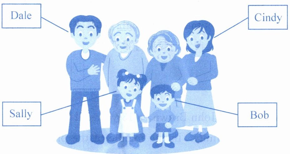 In the middle of my family photo,these are my grandparents. They are very kind and funny. They always make us laugh. That is my father,Dale. He is 40 years old and he is strict. That is my mother,Cindy. She is beautiful. She likes singing. My brother Bob is short. We are in the same class. Who's that girl? Oh,it's me!