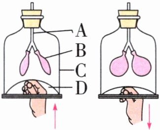 三、如图所示为演示呼吸运动的模型图,据图回答下列问题。