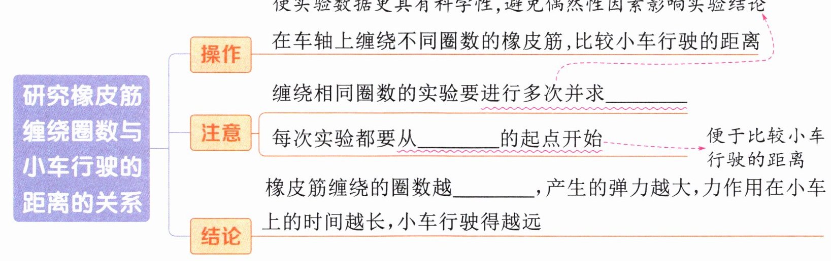 3. 用橡皮筋缠绕后被拉伸产生的力作动力,驱动小车运动,要让小车运动的距离更远,可以(