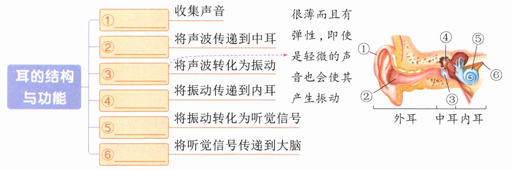 5. 在我们的耳朵里,时时刻刻都在接收各种声音并产生振动的结构是(