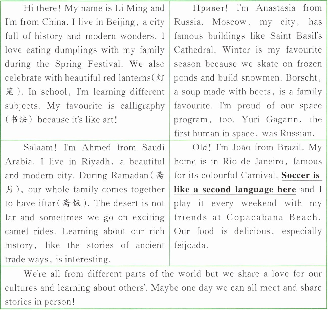 |Salaam! I'm Ahmed from Saudi Arabia. I live in Riyadh, a beautiful and modern city. During Ramadan(斋月), our whole family comes together to have iftar(斋饭). The desert is not far and sometimes we go on exciting camel rides. Learning about our rich history, like the stories of ancient trade ways, is interesting.|Olá! I'm João from Brazil. My home is in Rio de Janeiro, famous for its colourful Carnival. Soccer is like a second language here and I play it every weekend with my friends at Copacabana Beach. Our food is delicious, especially feijoada.|
