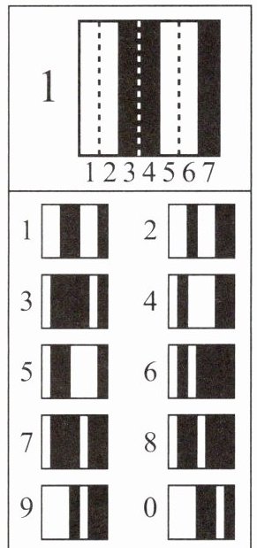 Each number in a barcode is shown by seven blocks of the same size. 3. For example, the number "one" is shown in turn by two white stripes(条), two black stripes, two white stripes, and one black stripe. 4.