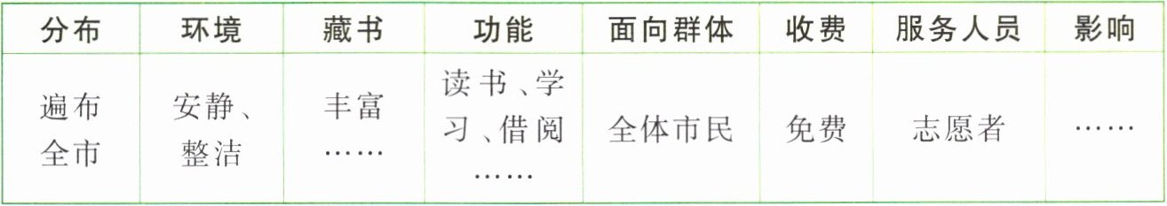 | 遍布全市 | 安静、整洁 | 丰富…… | 读书、学习、借阅…… | 全体市民 | 免费 | 志愿者 | …… |