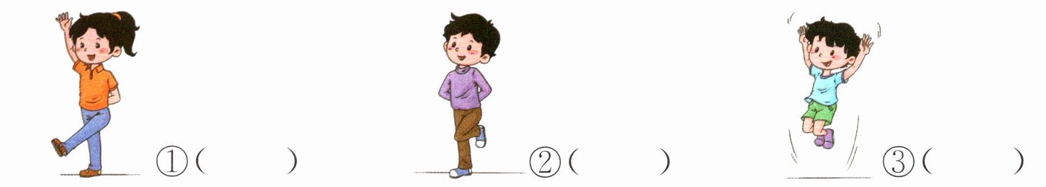 1. 指令:右手举高,左腿往前踢。下面哪位小朋友的动作正确?请在括号里打“√”。