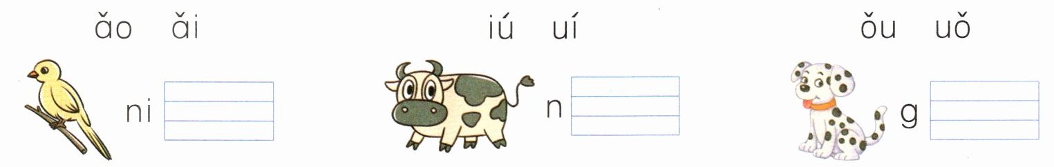 【解析】此题考查学生观察图片和对复韵母辨析的能力。先仔细观察图片,明确每幅图画的是什么,再结合图片内容,按照所学的拼写规则和标调规则认真拼读音节,完成填空。