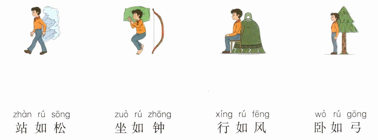 图片按从左至右的顺序依次是:行如风 卧如弓 坐如钟 站如松