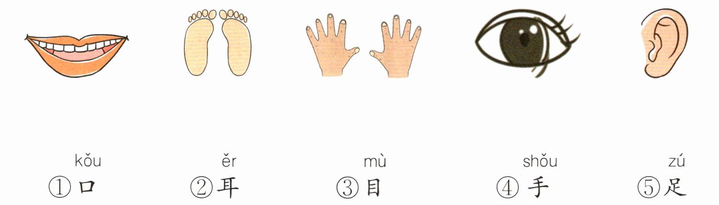 ①kǒu口 ②ěr耳 ③mù目 ④shǒu手 ⑤zú足