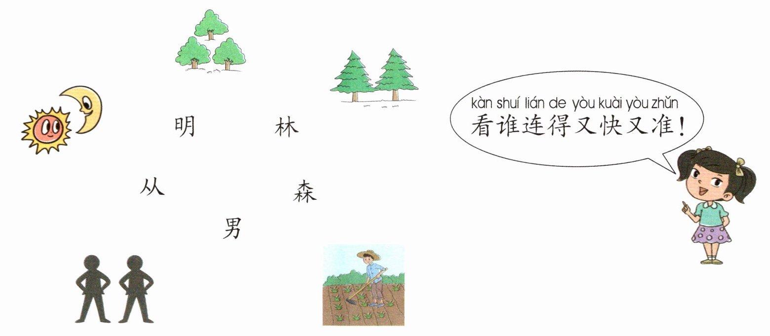三、图片从上至下、从左至右依次为:森 明 林 从 男 【解析】此题考查学生观察图片的能力和对会意字的掌握。完成这道题时应把图片和文字结合起来看。第一幅图画的是三棵树,一棵在上面,两棵在下面,很容易使人联想到“森”;第二幅图画的是一个太阳和一个月亮,很容易与“明”联系起来;第三幅图画的是两棵左右并排的树,对应的汉字应该是“林”;第四幅图中两个人并排而立,可以使人联想到“从”字;第五幅图中一个男人握着锄头在田里锄地,很容易使人联想到“男”字。