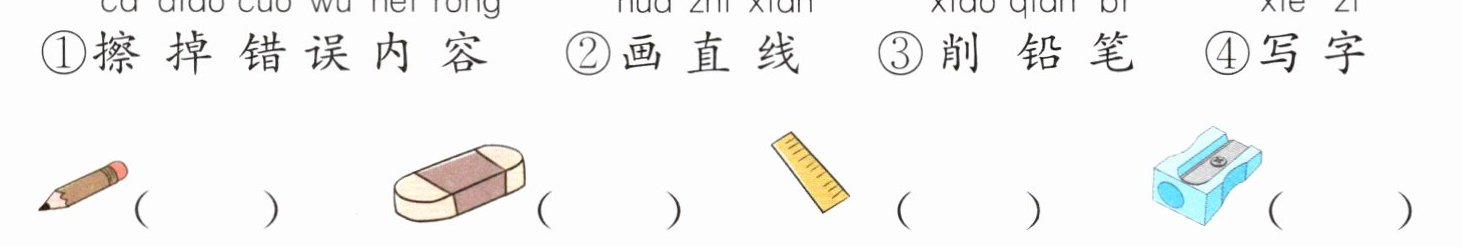 ①擦掉错误内容 ②画直线 ③削铅笔 ④写字