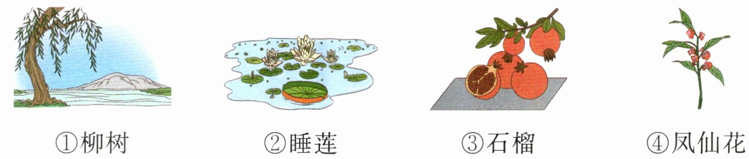 ④【解析】本题考查学生运用课内外知识的能力。根据课文内容可知,豌豆妈妈传播种子的方法是让豆荚晒在太阳底下,然后通过豆荚爆裂弹射的方式传播种子。结合课外资料可知,④中的凤仙花与豌豆相似,都通过弹射的方式传播种子;①中的柳树借助风力传播种子;②中的睡莲借助水流传播种子;③中的石榴依靠动物传播种子。故选择④。