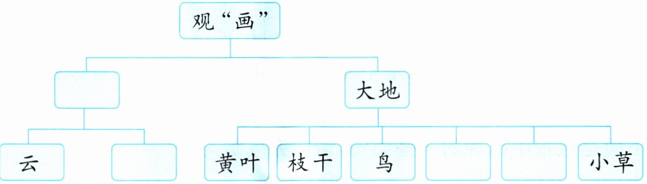 【解析】第2自然段描写的是“画”中的天空,第3自然段描写的是“画”中的大地。在这两个自然段中,按顺序找出作者描写的事物,将思维导图补充完整。