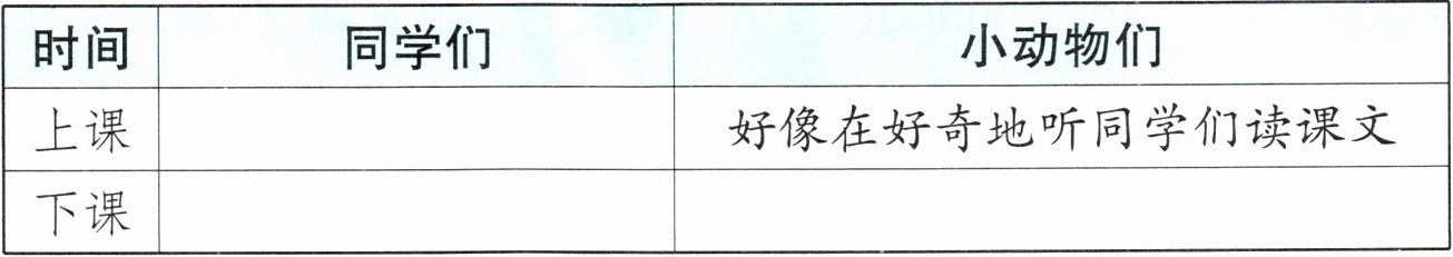 【解析】选段第1句话写的是同学们上课时的表现,第5句话写的是下课后同学们和小动物们的表现。熟读这两句话,概括出简练的语句将表格补充完整。