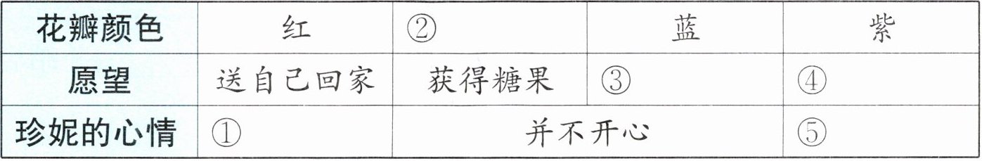 2. 珍妮用七色花实现了哪些愿望?请你根据短文内容完成下面的表格。