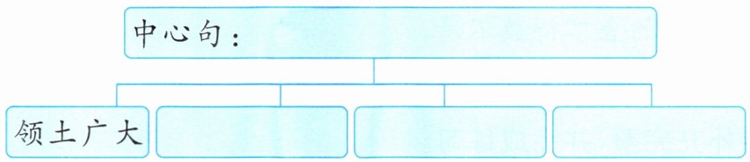 【解析】短文围绕着祖国的国土面积、物产、矿产资源和景色来写,第 1 自然段的第 1 句话是短文的中心句。第 2~5 自然段从不同的方面介绍了祖国的特点,这四个自然段的第 1 句话分别是各自然段的关键句,据此概括出关键词语来补充思维导图即可。