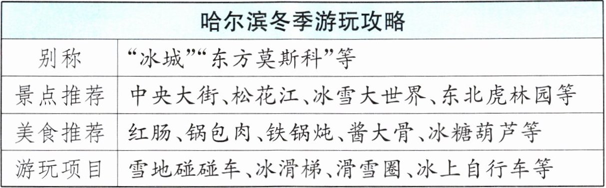 4. 寒假快到了,你很想让家里人带你去哈尔滨游玩,你会怎么向他们推荐哈尔滨这座城市呢?结合材料内容,简要说明理由。