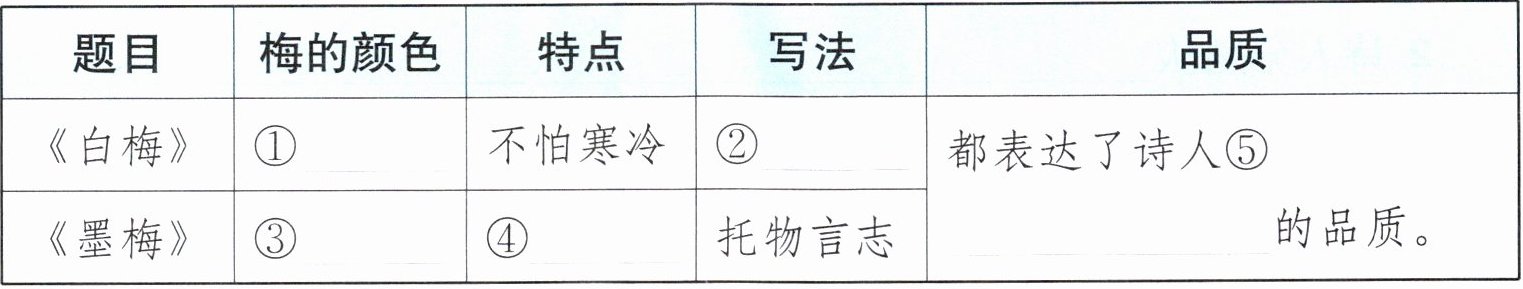 【解析】本题考查古诗理解。《墨梅》中的“清气”与《白梅》中的“清香”意思相似,都是写梅花的清香之气,用来比喻诗人的情操像梅花一样高洁。