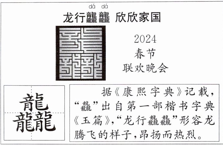 (3)“龘”字最早出自《康熙字典》,意指龙腾飞的样子,昂扬而热烈。(