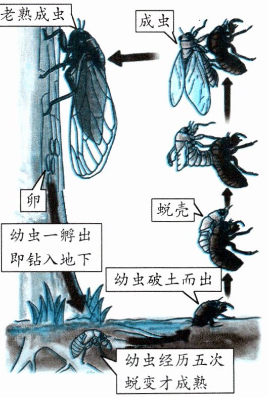 A. 蝉的幼虫从卵中孵化出来后,需要钻入地下开启长达2~17年的蛰伏期。