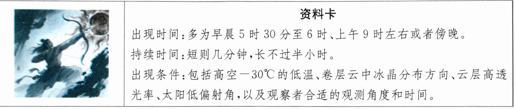 1.高空$-30^{\circ }C$的低温 卷层云中冰晶分布方向 云层高透光率 太阳低偏射角 观察者合适的观测角度 特定的时间 【解析】根据材料中资料卡的“出现条件”进行归纳总结。