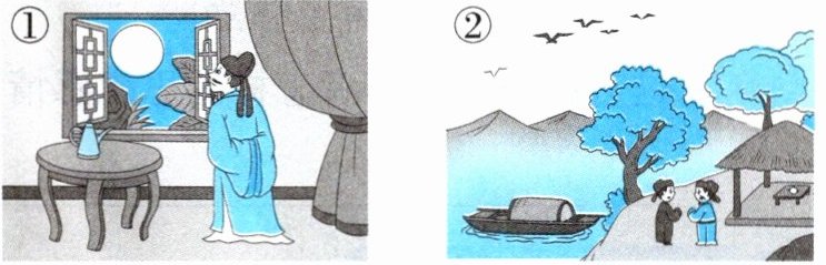 示例:举头望明月,低头思故乡。海内存知己,天涯若比邻。【解析】观察图中人物、环境,推测发生的故事,然后找出相应的诗句。如第①幅图,图上画了一个人面对窗外的月亮,独自思索。我们会想起李白写的《静夜思》。
