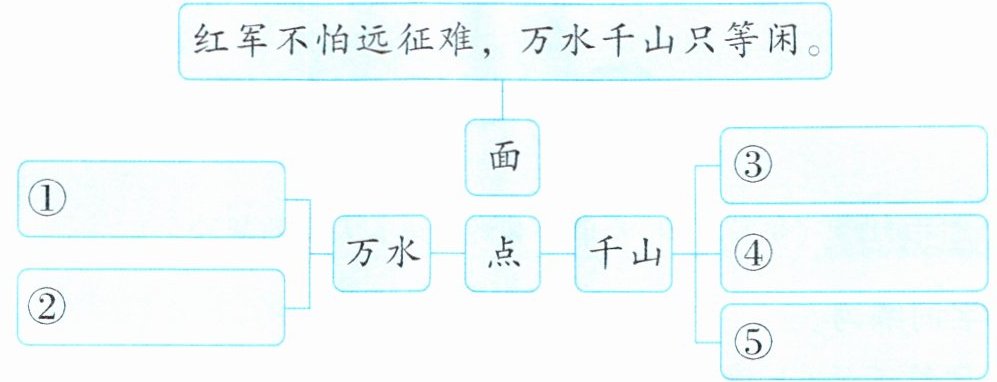 1.①金沙江 ②大渡河 ③五岭 ④乌蒙山 ⑤岷山 【解析】本题考查对整首诗的理解。注意诗中点面结合的运用。