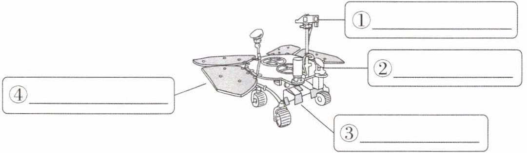 【解析】通过材料二可知,最上方的方形盒子是全景相机和多光谱相机,“翅膀”是太阳能电池板。结合“此外,火星车还配有探测雷达、磁场探测仪和气象测量仪,可对火星进行全方位的探测”可知,距地面较近的为探测雷达,旁边为磁场探测仪。