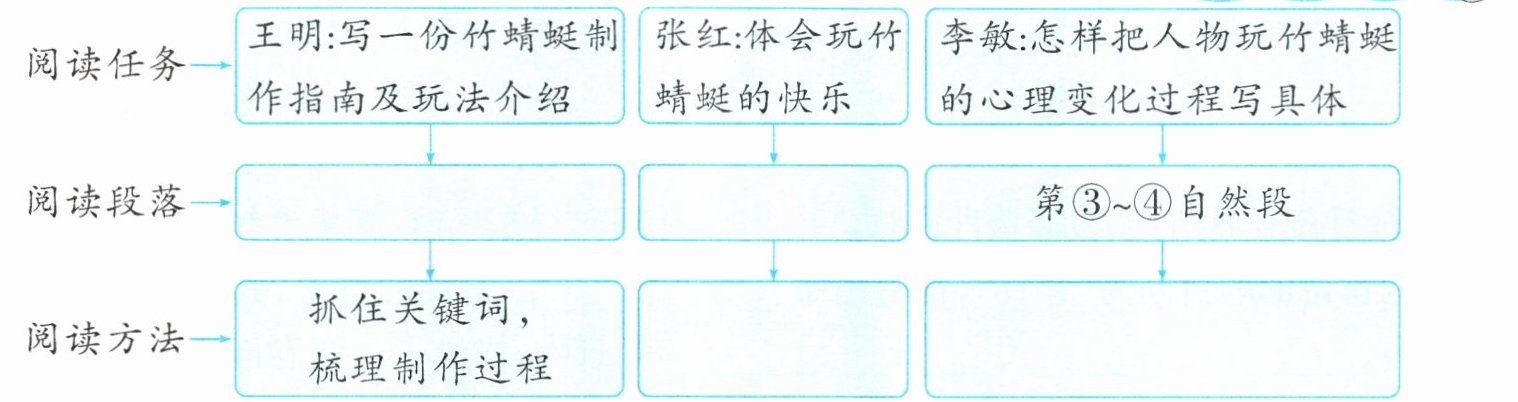 | 阅读任务 | 王明:写一份竹蜻蜓制作指南及玩法介绍 | 张红:体会玩竹蜻蜓的快乐 | 李敏:怎样把人物玩竹蜻蜓的心理变化过程写具体 |