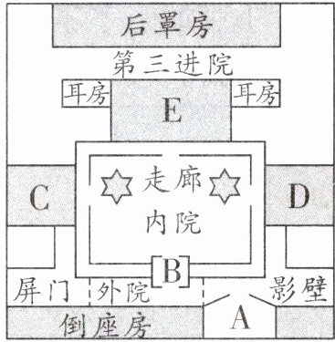 3.A. 正门 B. 垂花门 C. 西厢房 D. 东厢房 E. 正房 【解析】本题考查提取关键信息,阅读材料二,结合图片,将建筑名称与序号对应即可。